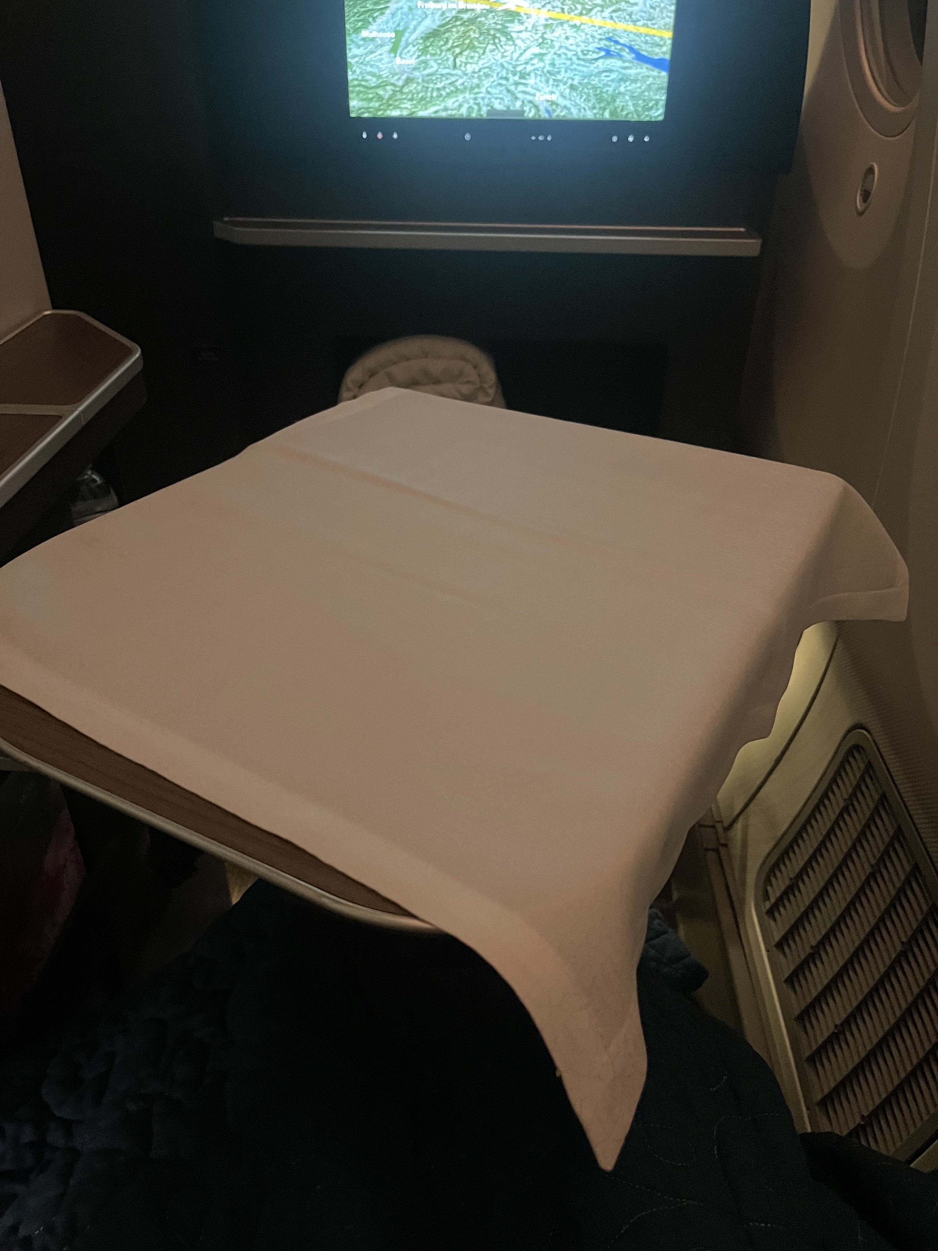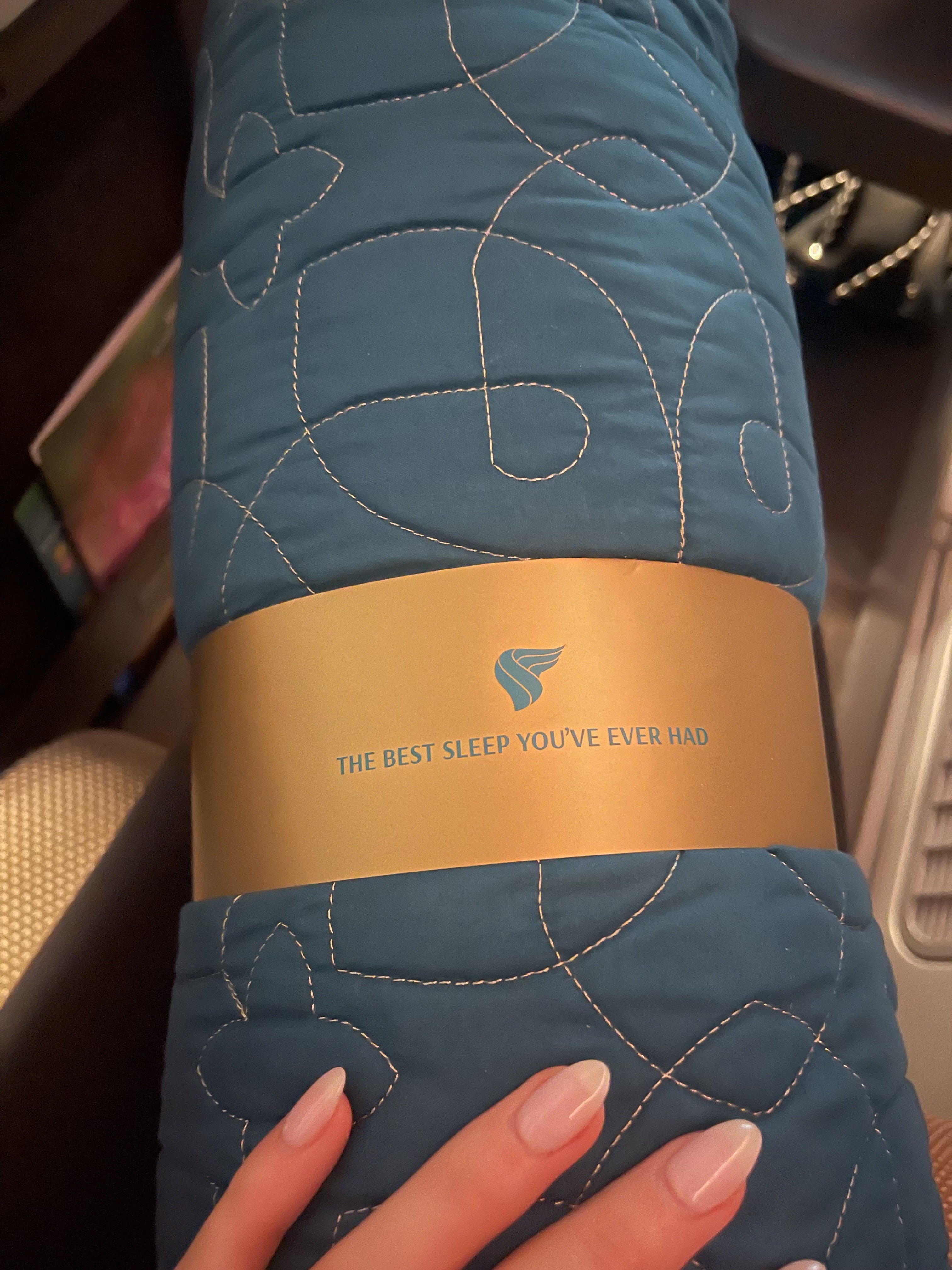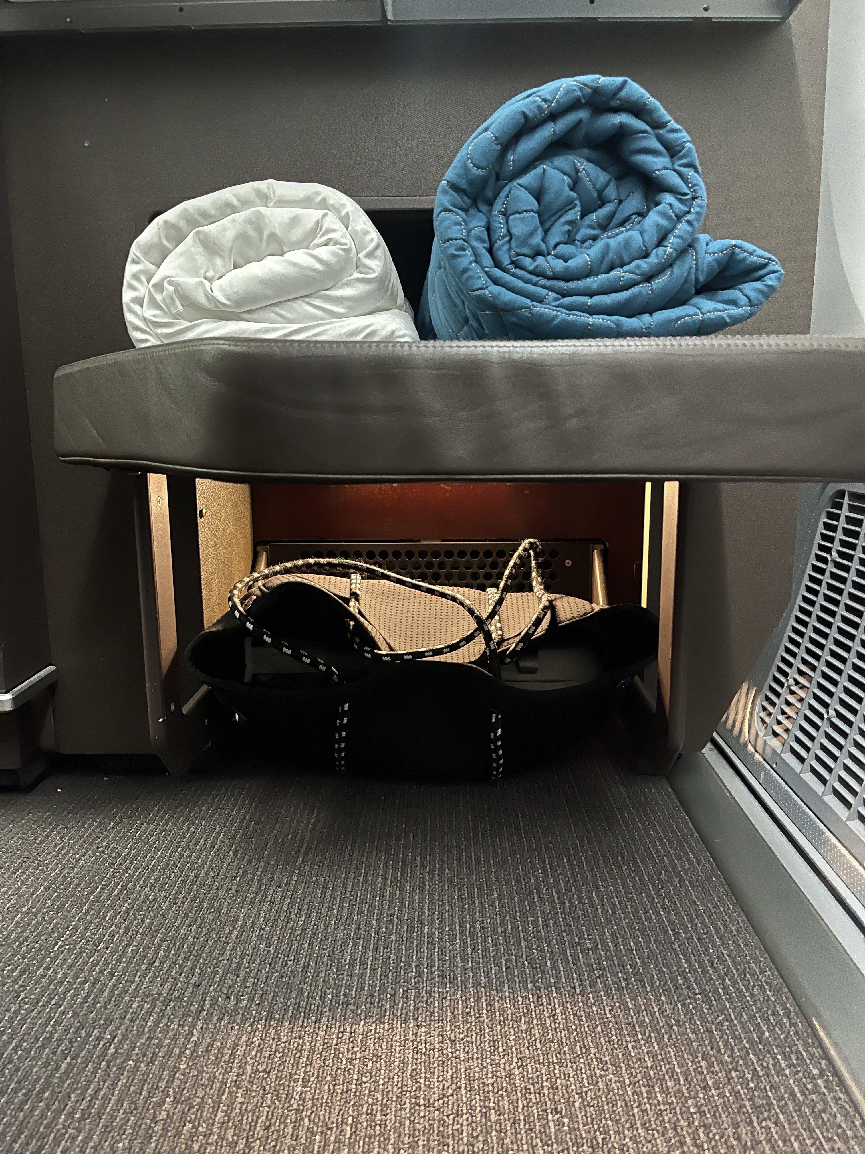 When we boarded there was a pillow and blanket on our seat, and a mattress topper on our footrest. The blanket and mattress topper were both wrapped up nicely with a little note ‘the best sleep you’ve ever had’. We found this to be a nice touch, rather than just being wrapped in plastic - small details make a big difference.
