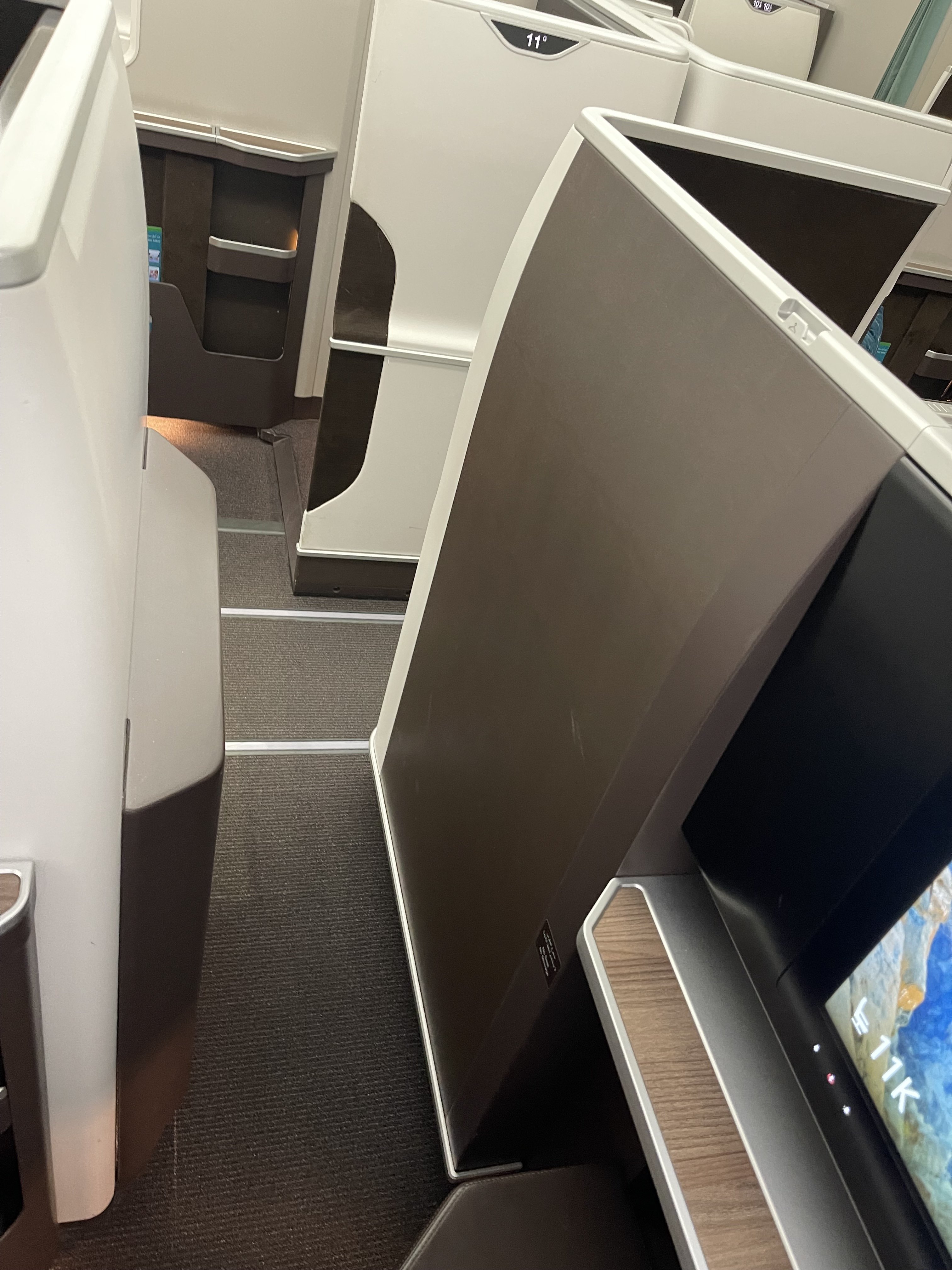 In order to create the walkway to the window seat, the seats are slightly staggered, meaning the one closer to the aisle sits slightly back, and the one against the window sits slightly forward. We were concerned as we felt this could put us in close proximity to the passenger next door, but there is a screen that can be raised by simply pushing a button, allowing a great amount of privacy.