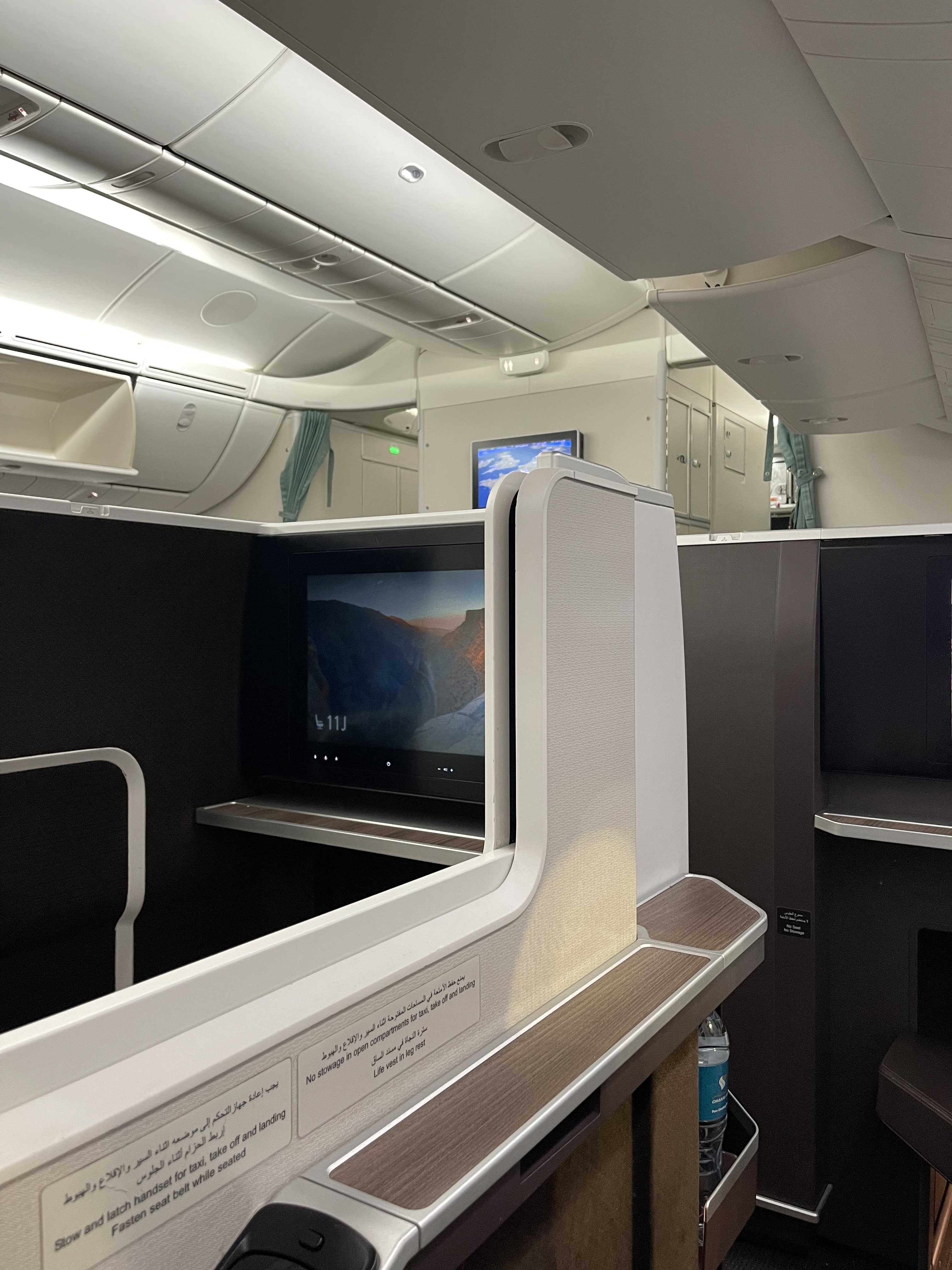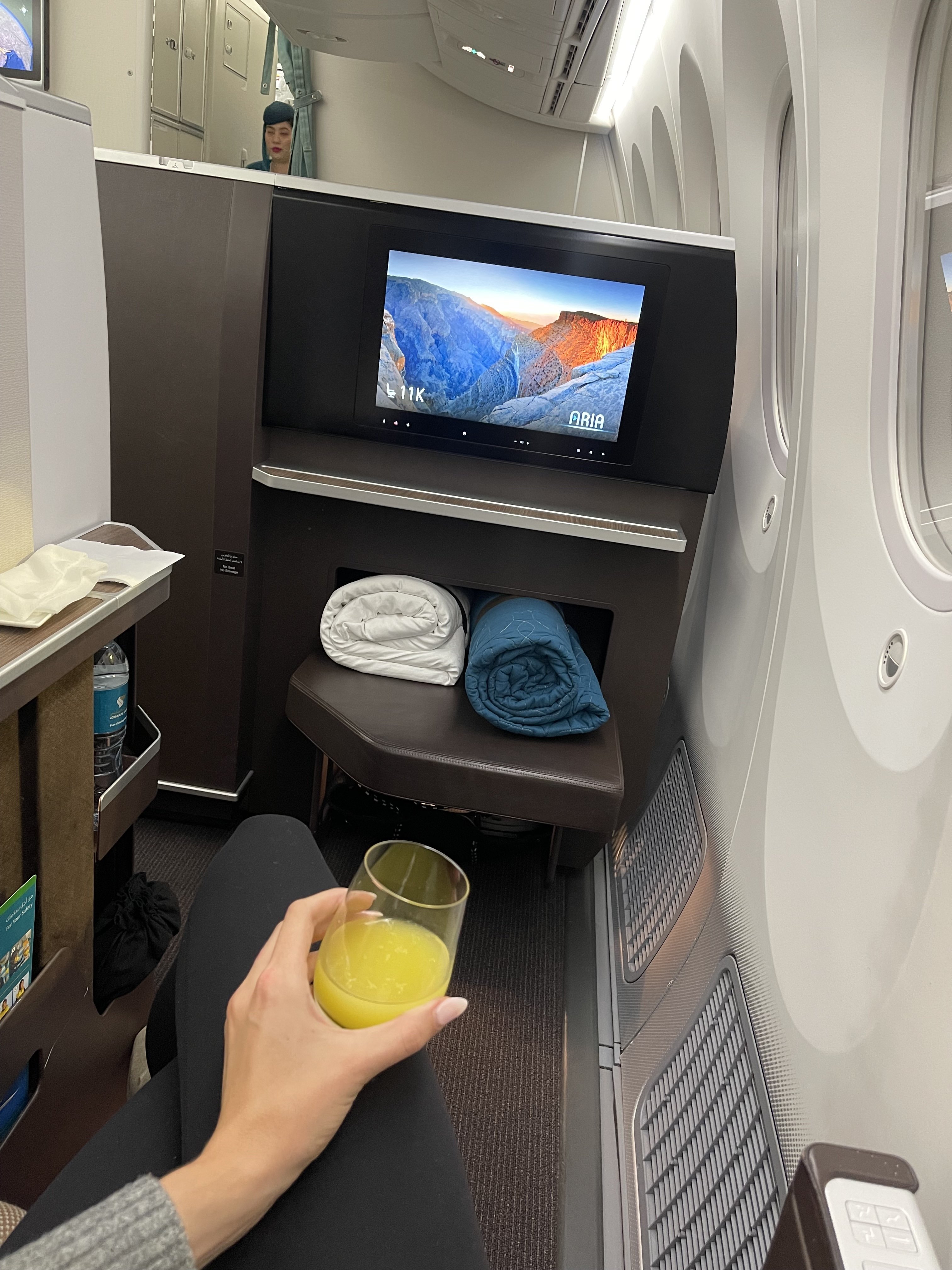 We were excited to finally experience Business Class with Oman Air and it did not disappoint. The seats were comfortable while the entertainment screens and seat controls were modern. Our meals were good quality and we appreciated the length the flight attendants go to in order to set each table individually, rather than just provide your entire meal on one tray.