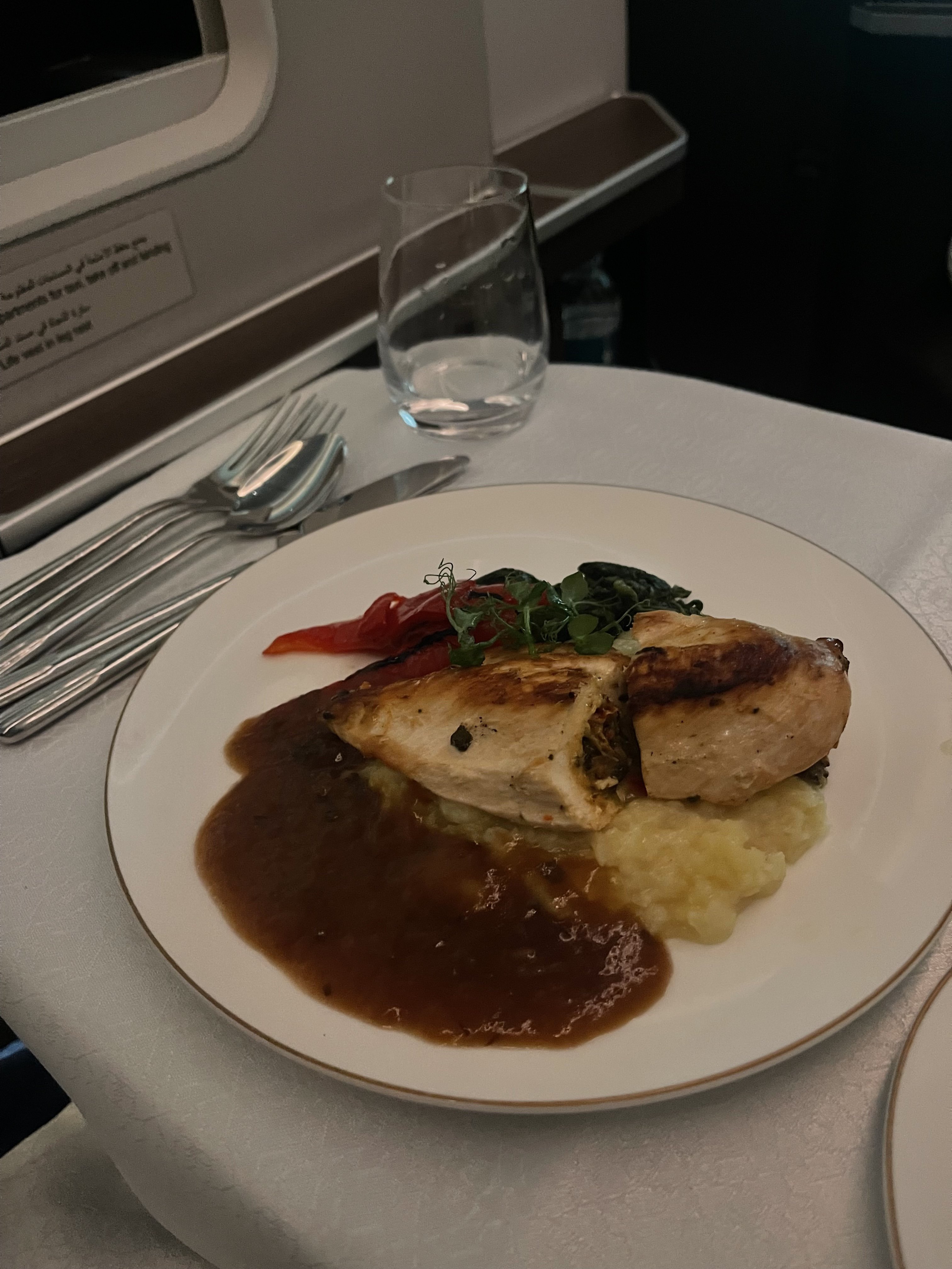 Shortly after this we were provided with our main, the Stuffed Chicken Breast with Spinach. This had a rich flavour and surprisingly the chicken wasn’t too overcooked nor tasted reheated - something that’s very common not only with aeroplane food, but chicken in general. The mash was creamy and the spinach added a nice amount of greens to the meal