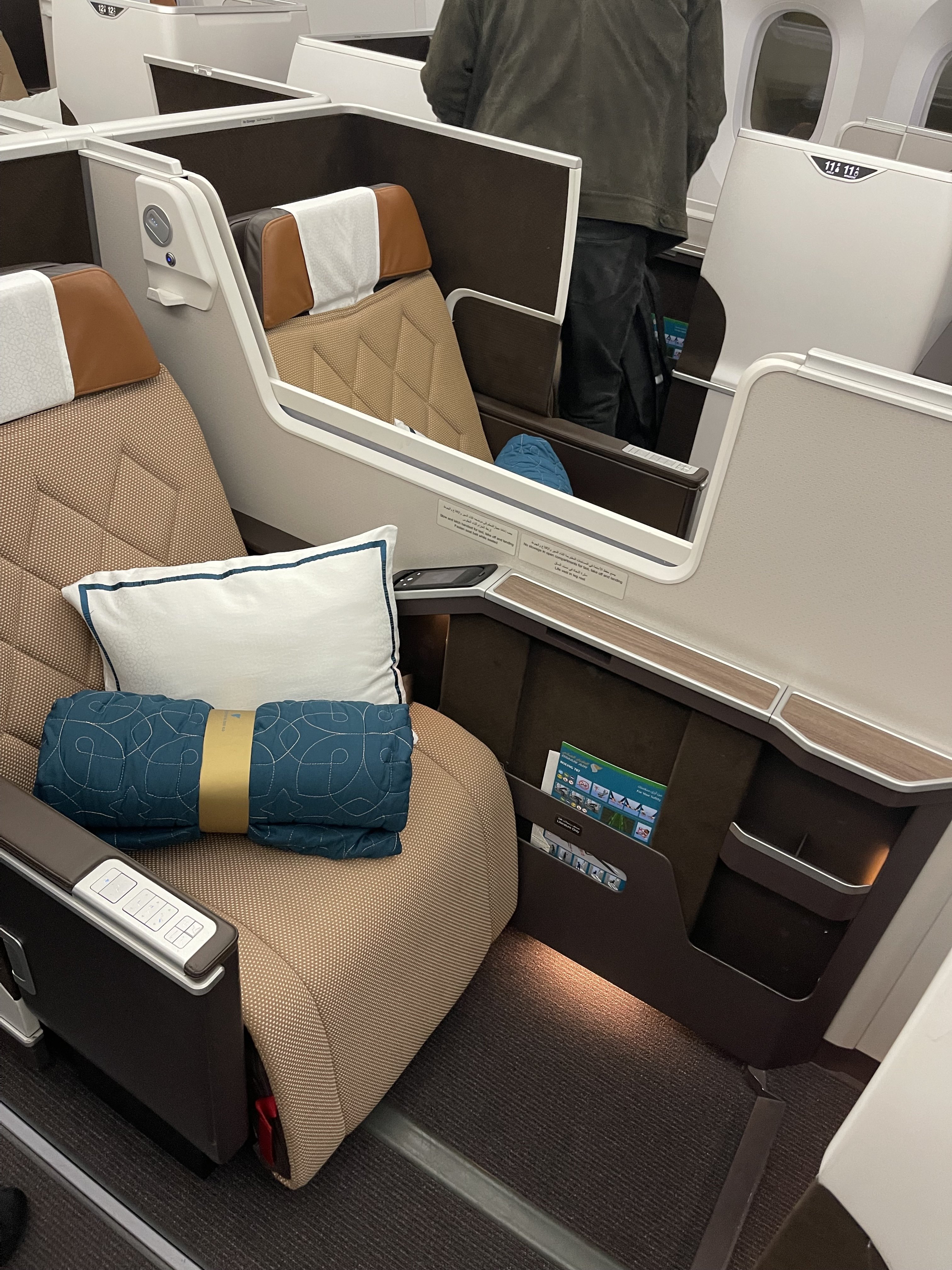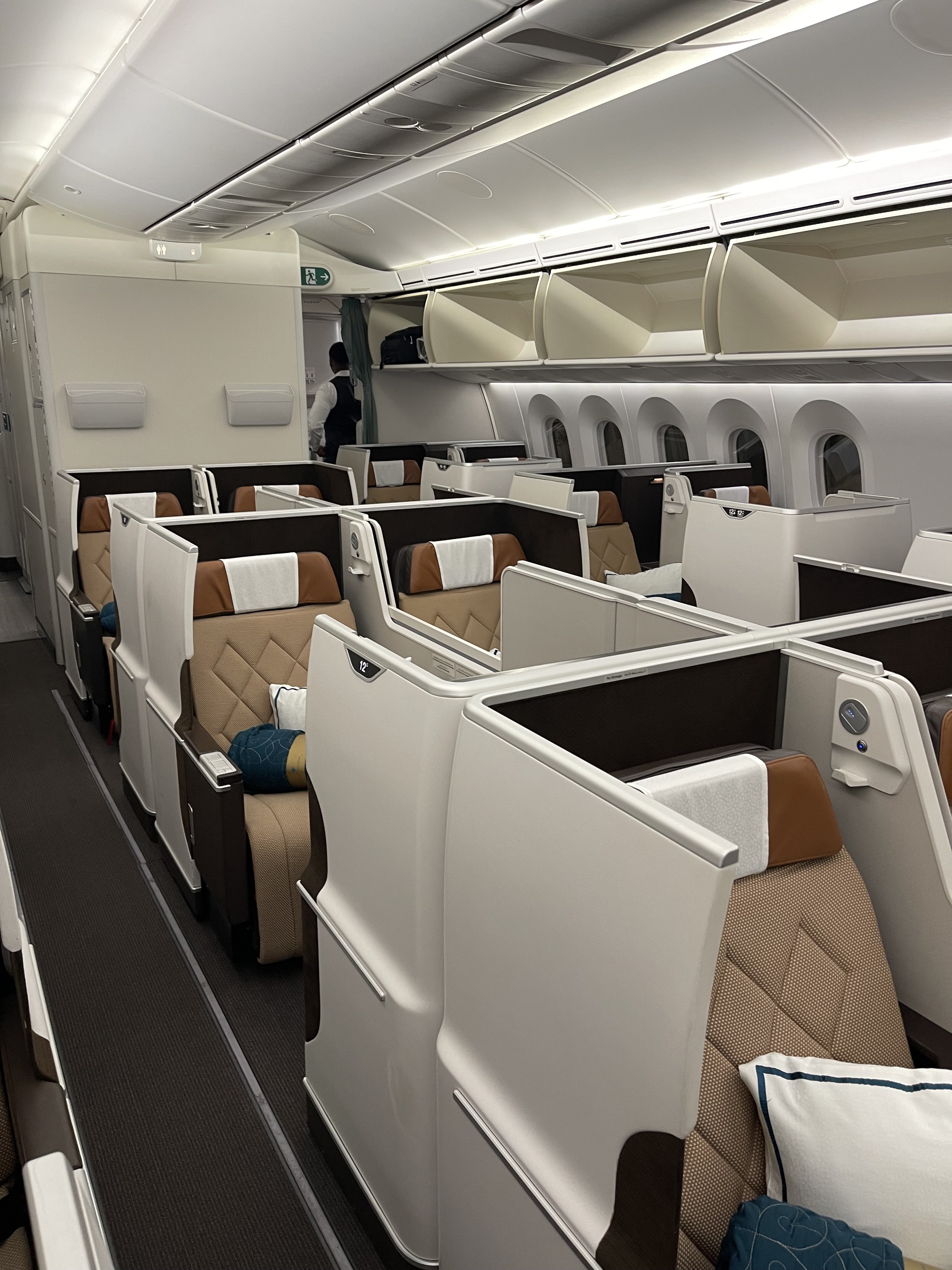 The Oman Air Business Class cabin is set out in a 2-2-2 configuration. Don’t let this fool you, each seat still has direct aisle access thanks to the handy walkway between the two seats. We were seated in 11K, a window seat on the right hand side of the plane. We felt this seat provided the most privacy out of all of them, as you felt tucked away in the cabin.