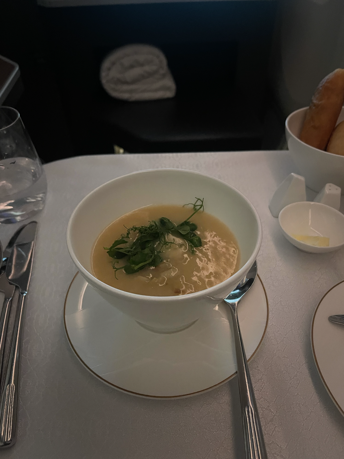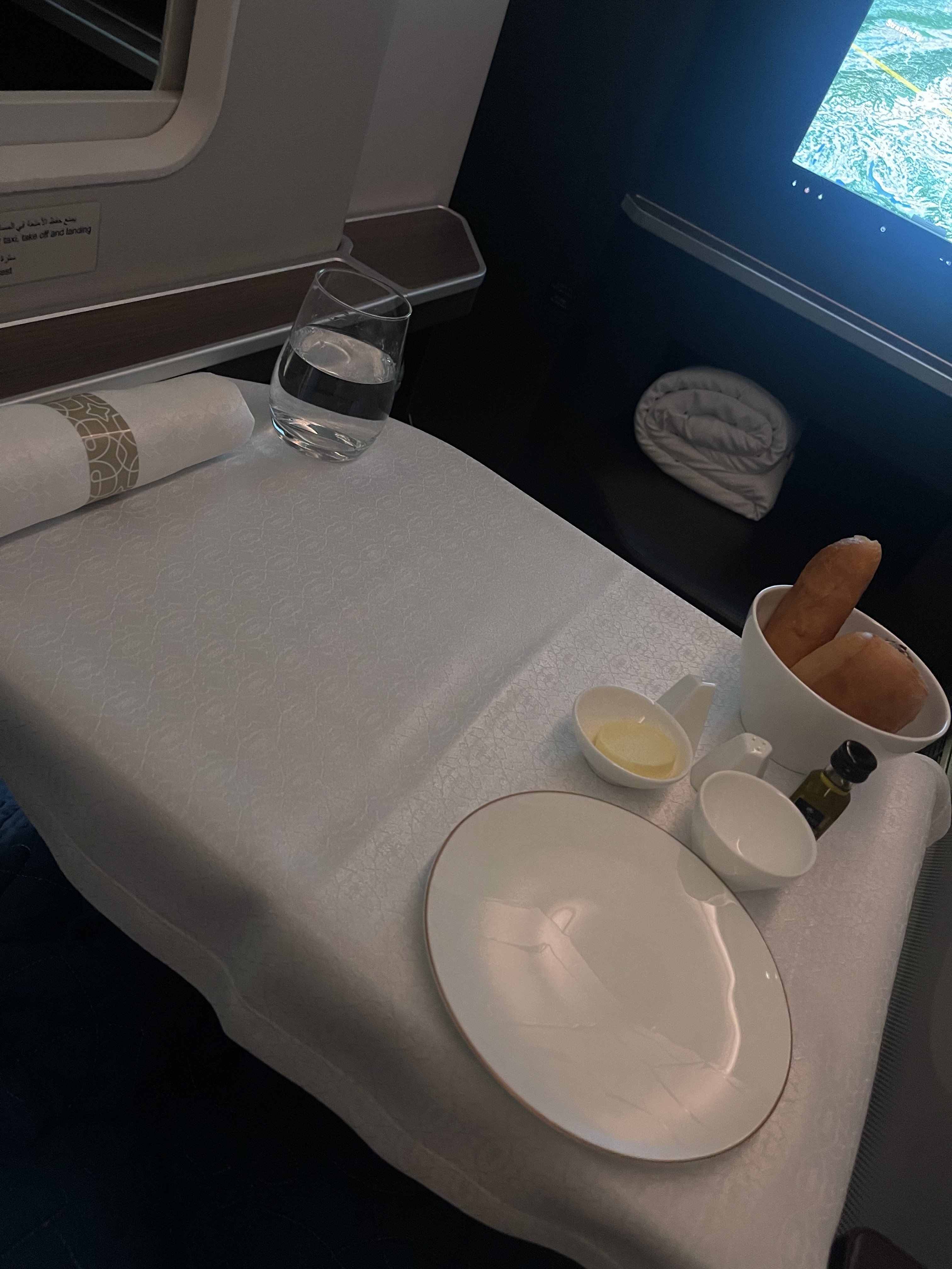 A table was set shortly after this with a white table cloth, salt and pepper, a selection of warm fresh breads, olive oil and balsamic vinegar, butter and our cutlery. We really liked how our table was set similar to how you dine in a restaurant, and no plastic trays were involved. Every section of the meal was bought out individually on its own plate, making the dining experience that bit nicer.