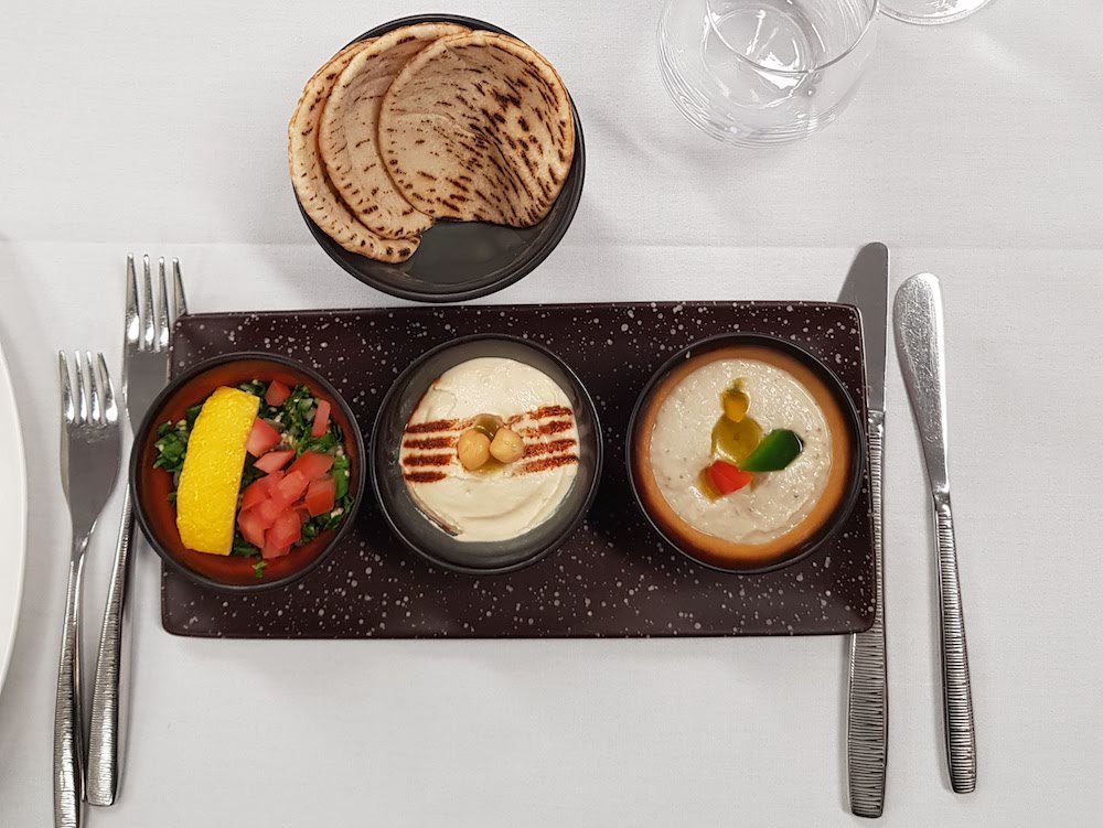 We tasted 2 options from the Qatar Airways business class entree menu, the Cured Fillet of Salmon was served with a celeriac remoulade, caper berries, dill and a lemon olive oil and the Qatar Airways signature mezze plate which included tabouleh and hummus served with traditional Arabic flat bread.