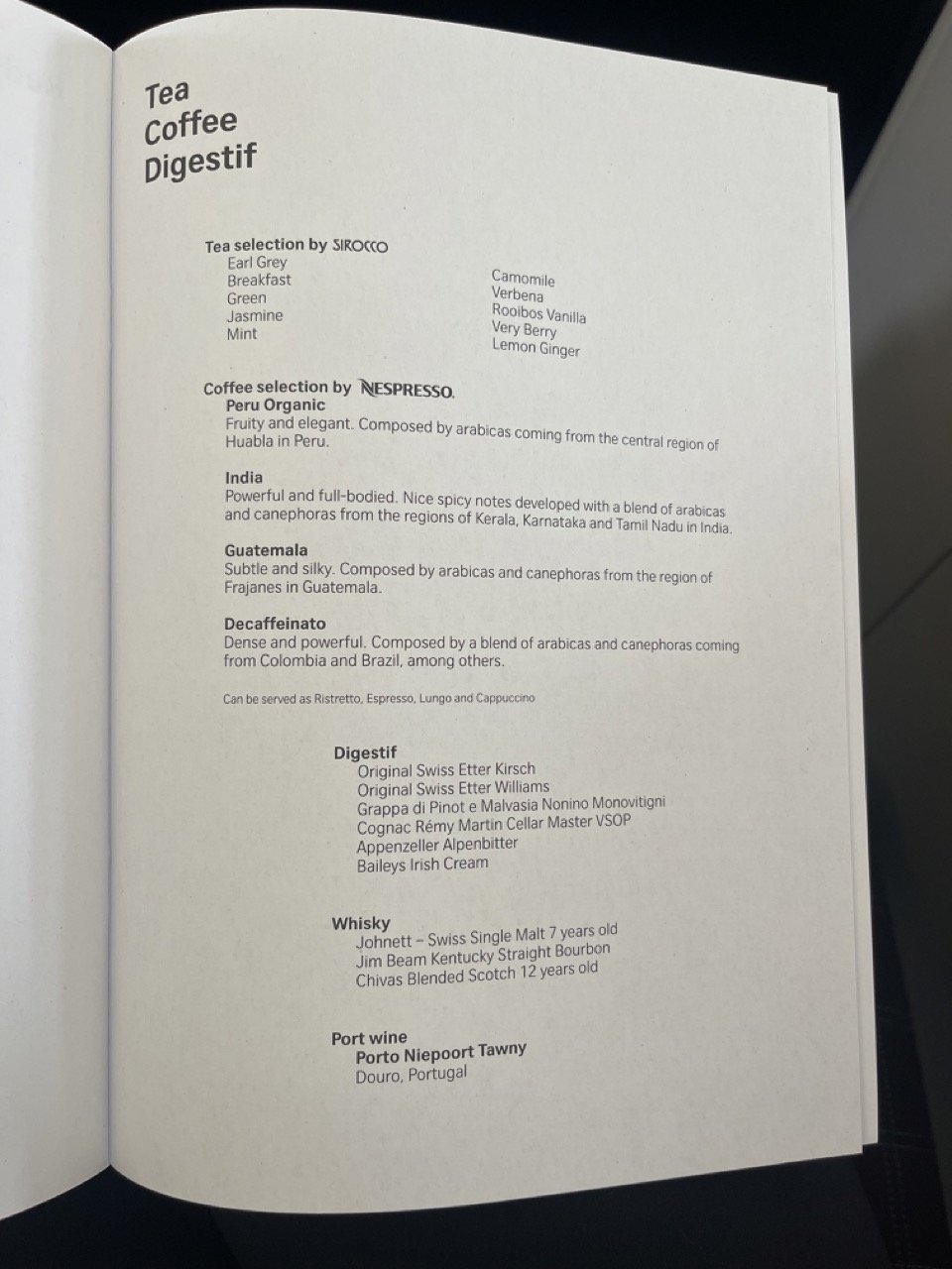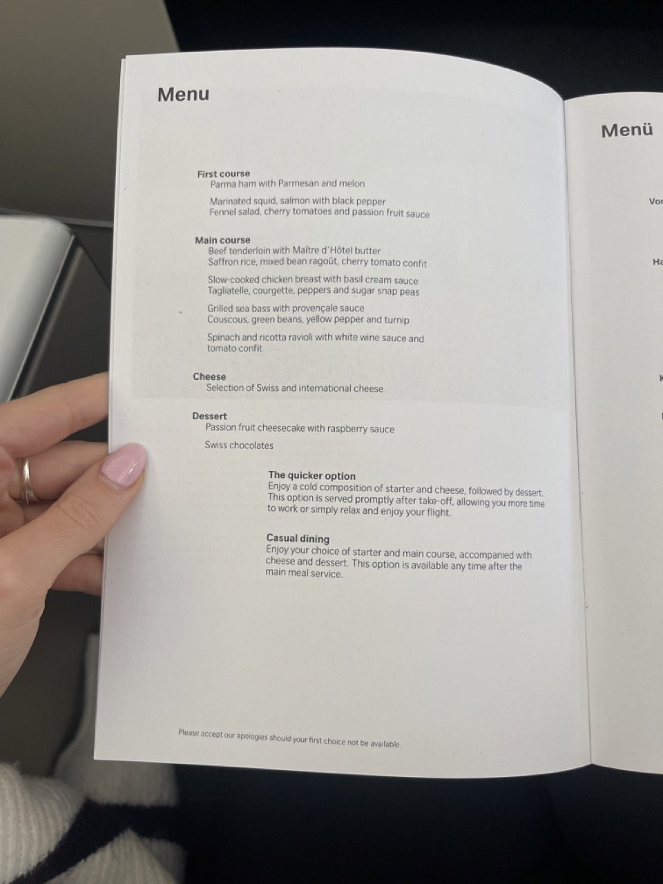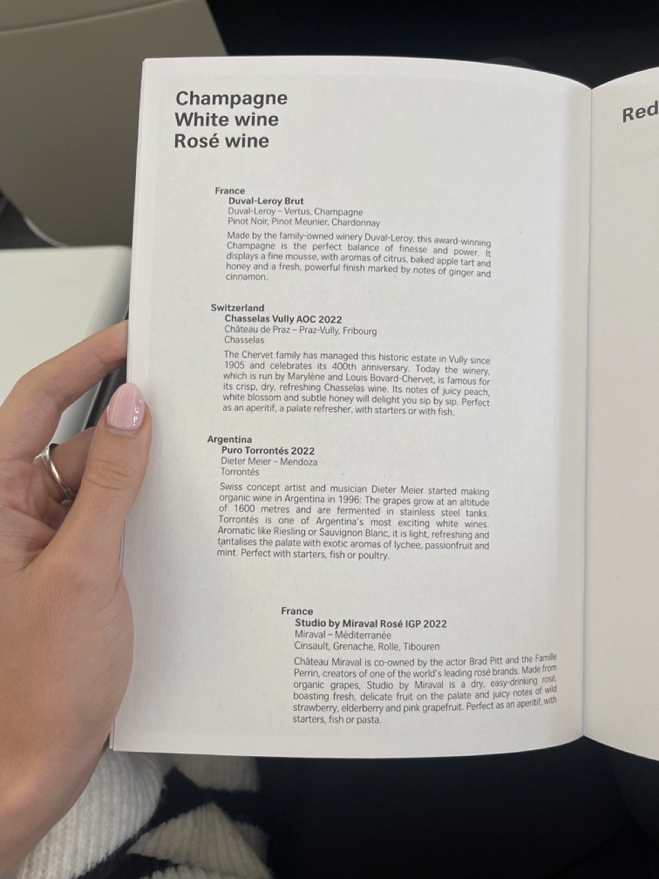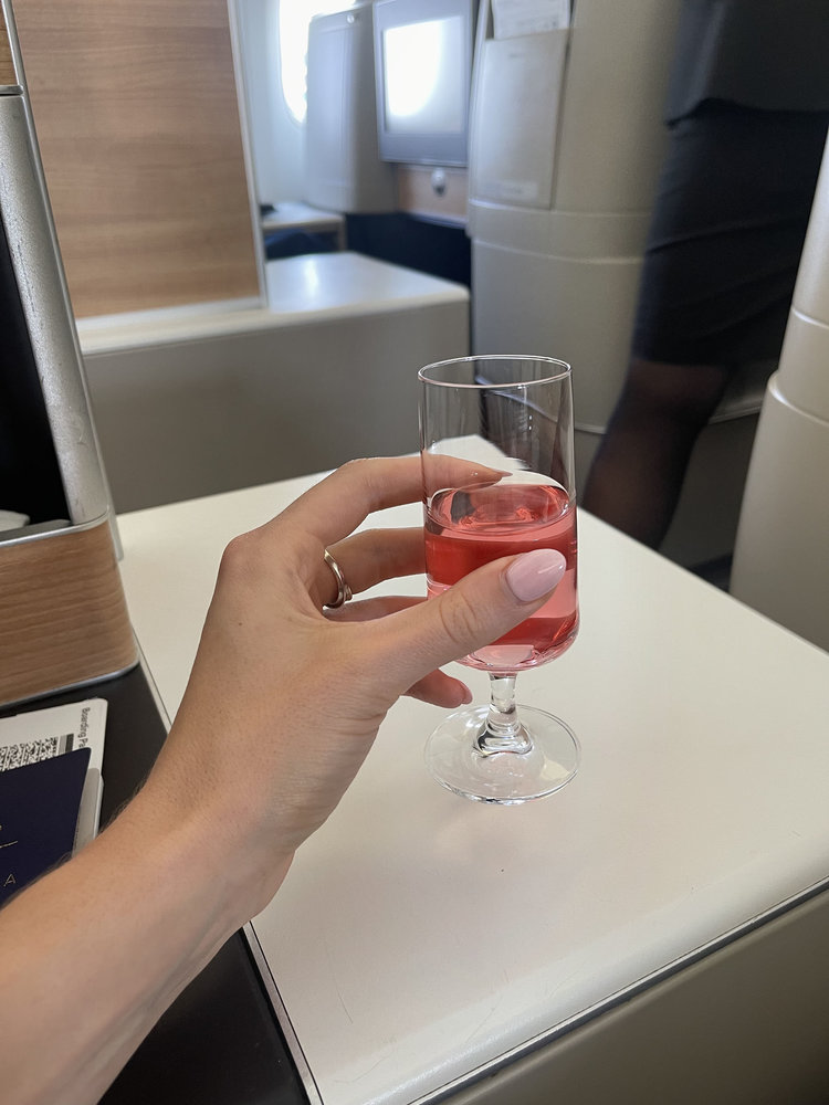 Shortly after boarding, we were offered a choice of complimentary champagne or pink soda. We opted for the soda which was refreshing and delicious. While we enjoyed our soda the cabin crew provided the inflight menu to select our entree and a main, or could opt for the express menu being a selection of cheeses and smaller meals.