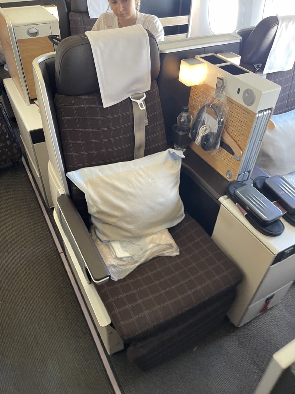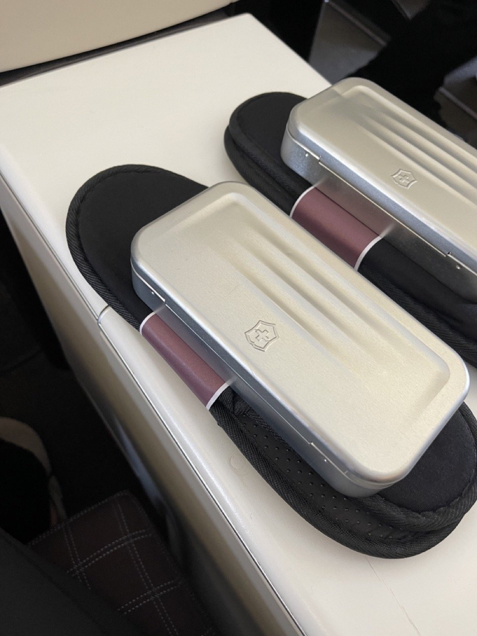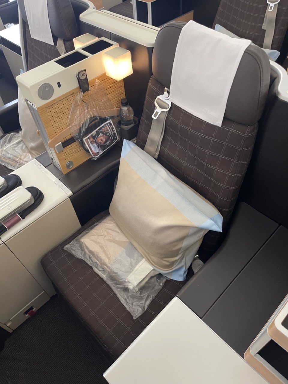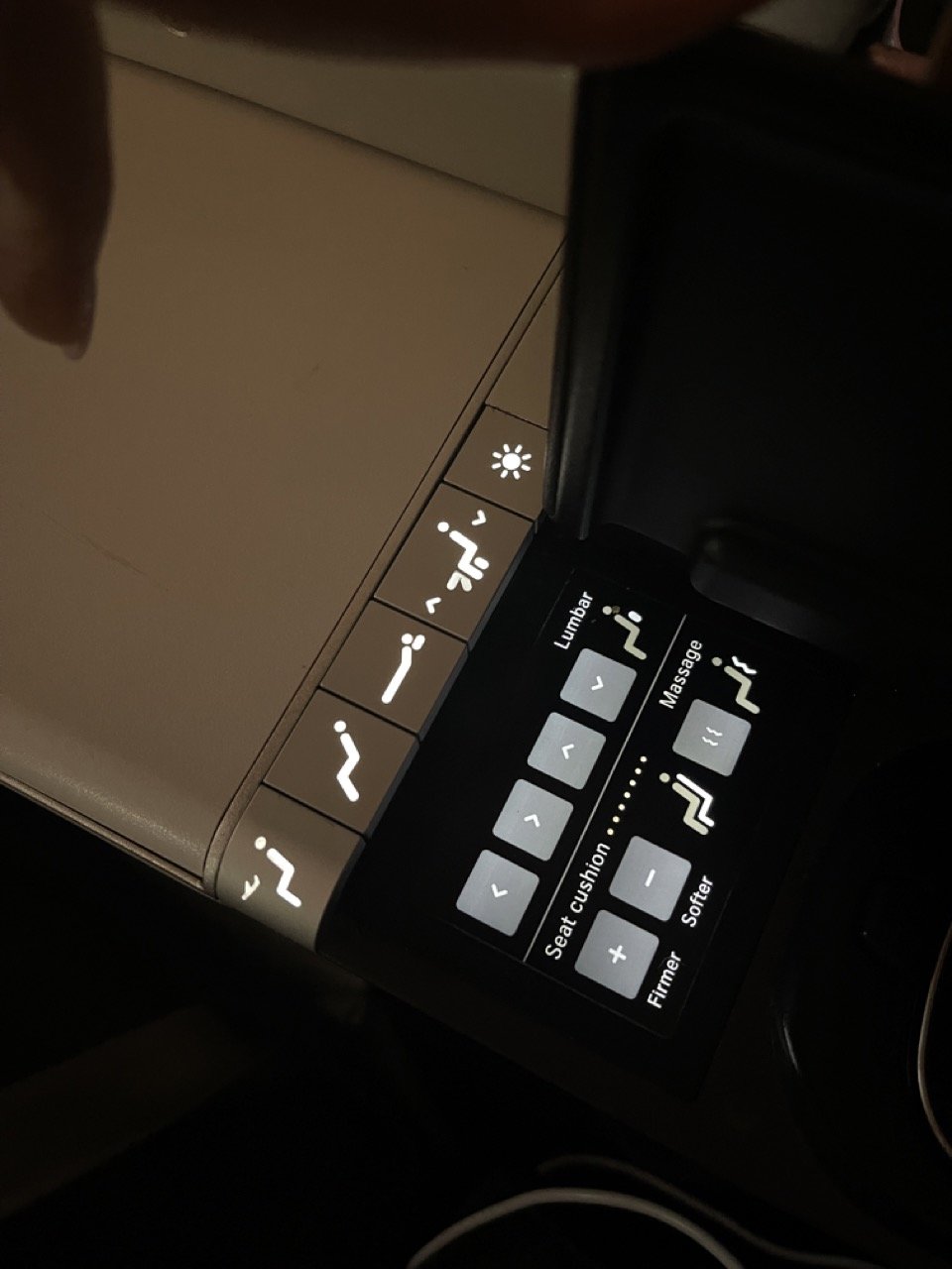 When we arrived at our seat a pillow and blanket were provided on the seat while a set of headphones, a bottle of water and a coat hanger were located to the right of the seat. To the left was a small storage compartment and shelving that fit a book, the amenity kit, the slippers, and any smaller objects we had, In the amenity kit there were a pair of slippers (very handy when getting up to use the bathroom), socks, an eye mask, earplugs, toothbrush and toothpaste. The seat was easy to control with large buttons and options to adjust the cushion and have a massage.