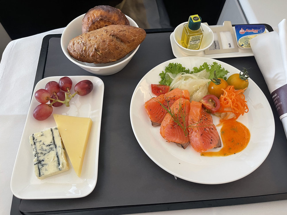 Shortly after this, the cabin crew came around to set everyone's tray tables with a white tablecloth, ready for meal service. For our entree we chose the Marinated Squid, Salmon with black pepper, fennel salad, cherry tomatoes and passionfruit sauce, unfortunately, the Salmon was not to our taste but the sauce was very tangy and fresh.