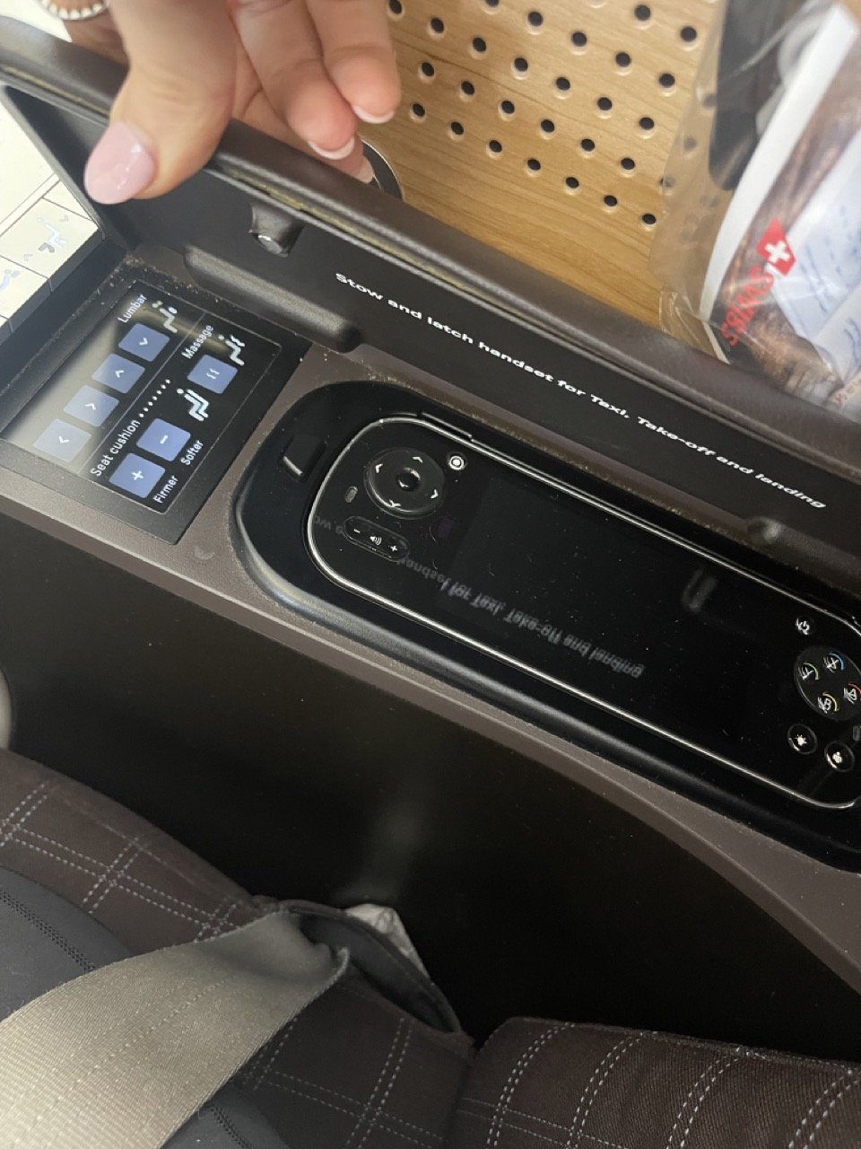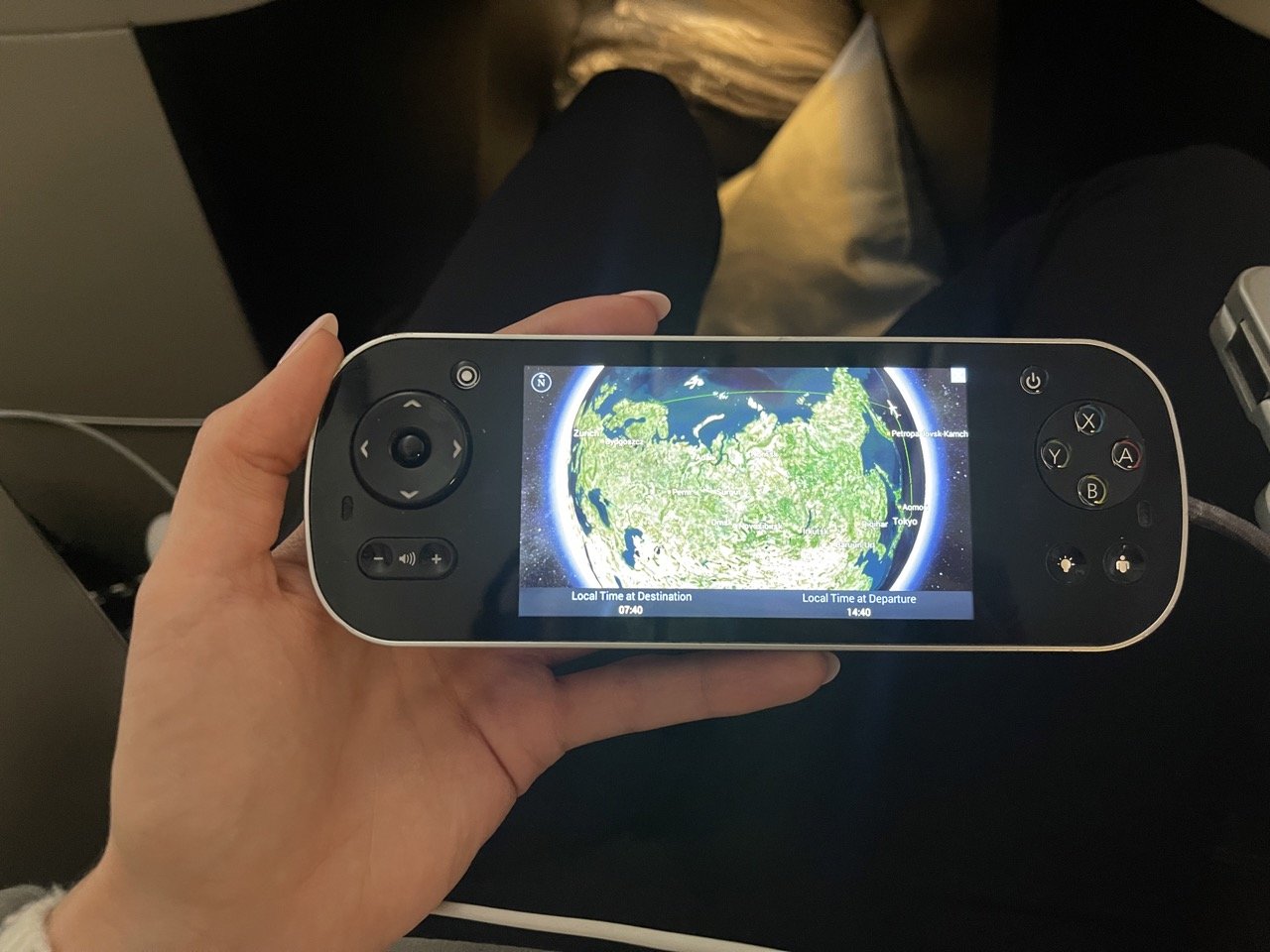 A remote was also located to the right of our seat, tucked away in its own storage compartment. There was a large screen on the remote which allowed us to view our flight path at the same time we were watching a movie.