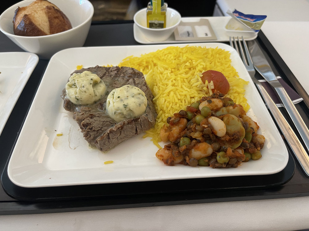 Along with our meal, we were also served a selection of bread rolls, cheese and grapes. For the Main course, we chose the Beef tenderloin with maitre d’hotel butter, saffron rice, mixed bean ragout and cherry tomato confit. Unfortunately, the beef wasn’t very appetizing but the saffron rice and bean ragout was spicy and delicious.