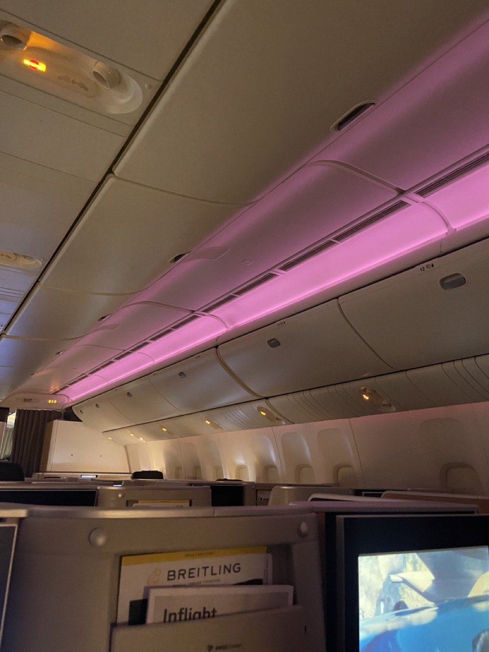 After meal service, the cabin lights were dimmed for those that wished to sleep, with a pink hue remaining through the cabin.